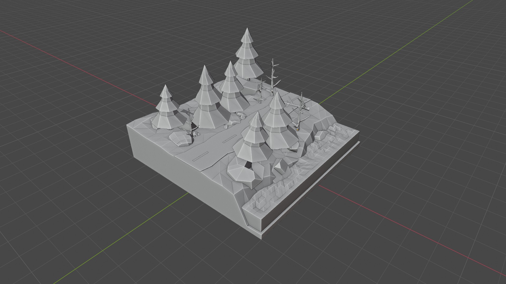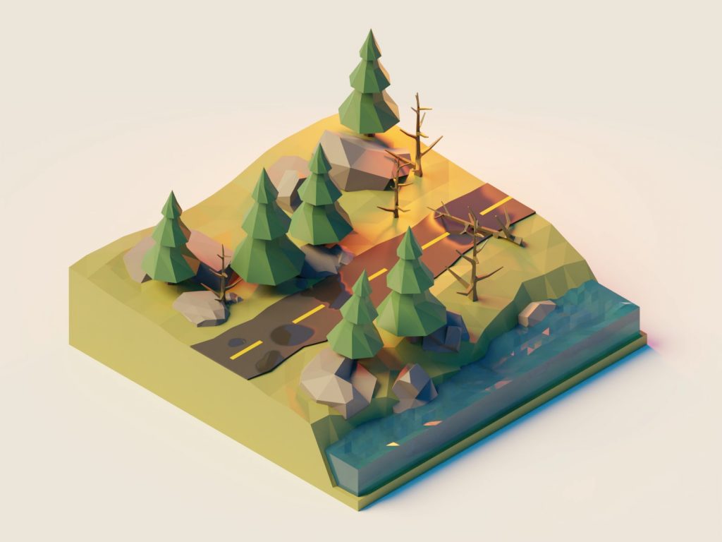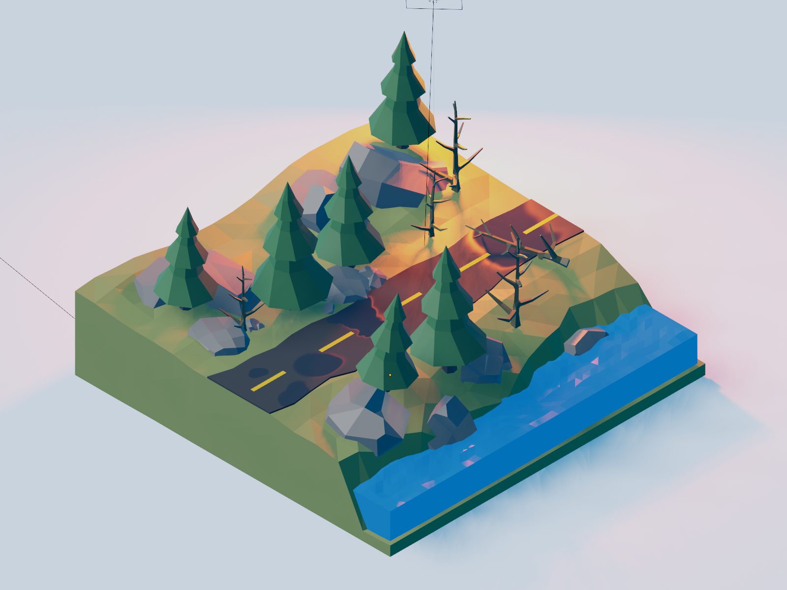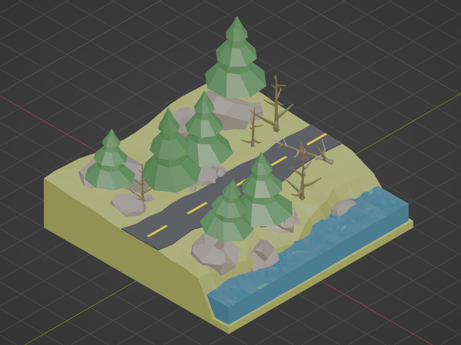 River and Forest is another simple tutorial that will teach you same basic techniques for modeling. It will show you also how to use texture painting to paint a reflective surface on the road, which was used to make the road appear wet.